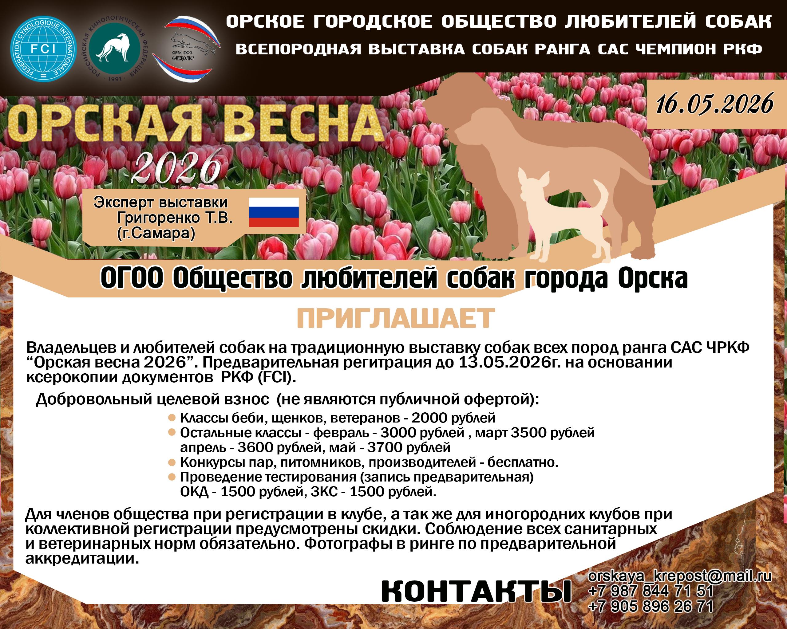 Выставка собак всех пород ранга САС ЧРКФ г. Орск "Орская весна - 2026" (16 мая 2026)